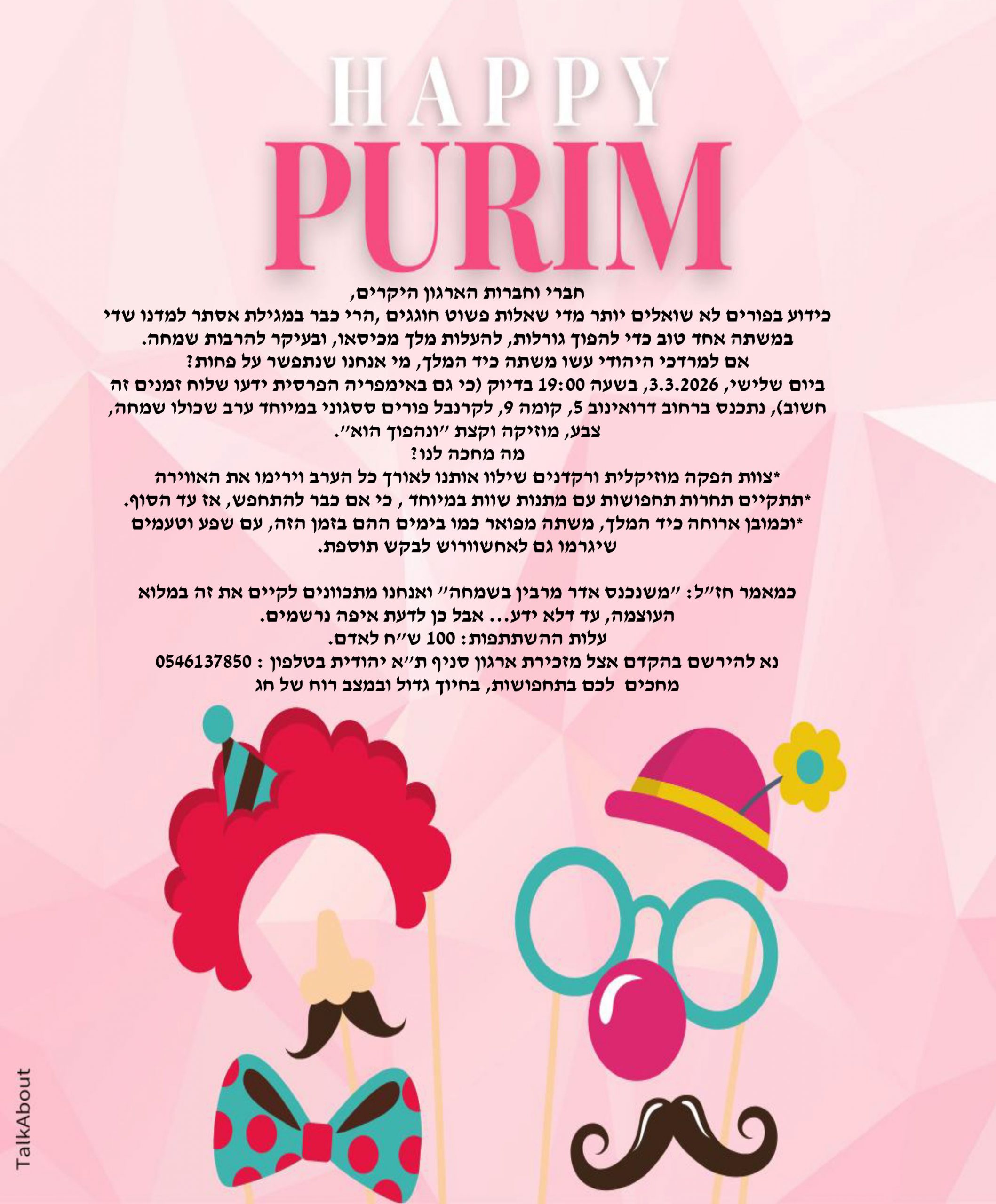 עלות ההשתתפות: 100 ש"ח לאדם